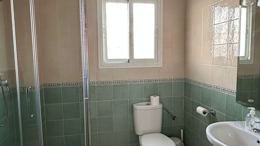 Beide andere kamers zijn beide voorzien van riante inbouwkasten. Aan de plafonds hangen fans en boven de deuren airco’s. Aan de andere kant van de gang bevindt zich de tweede badkamer met douche, wastafel en toilet. Warm water wordt verzorgd door een zonneboiler. Tenzij het heel bewolkt is, beschik je daarmee over heel warm water. Wel moet je even wachten voordat dit ook uit de kraan komt. Als het bewolkt is, dan is er nog een elektrische boiler als back-up.